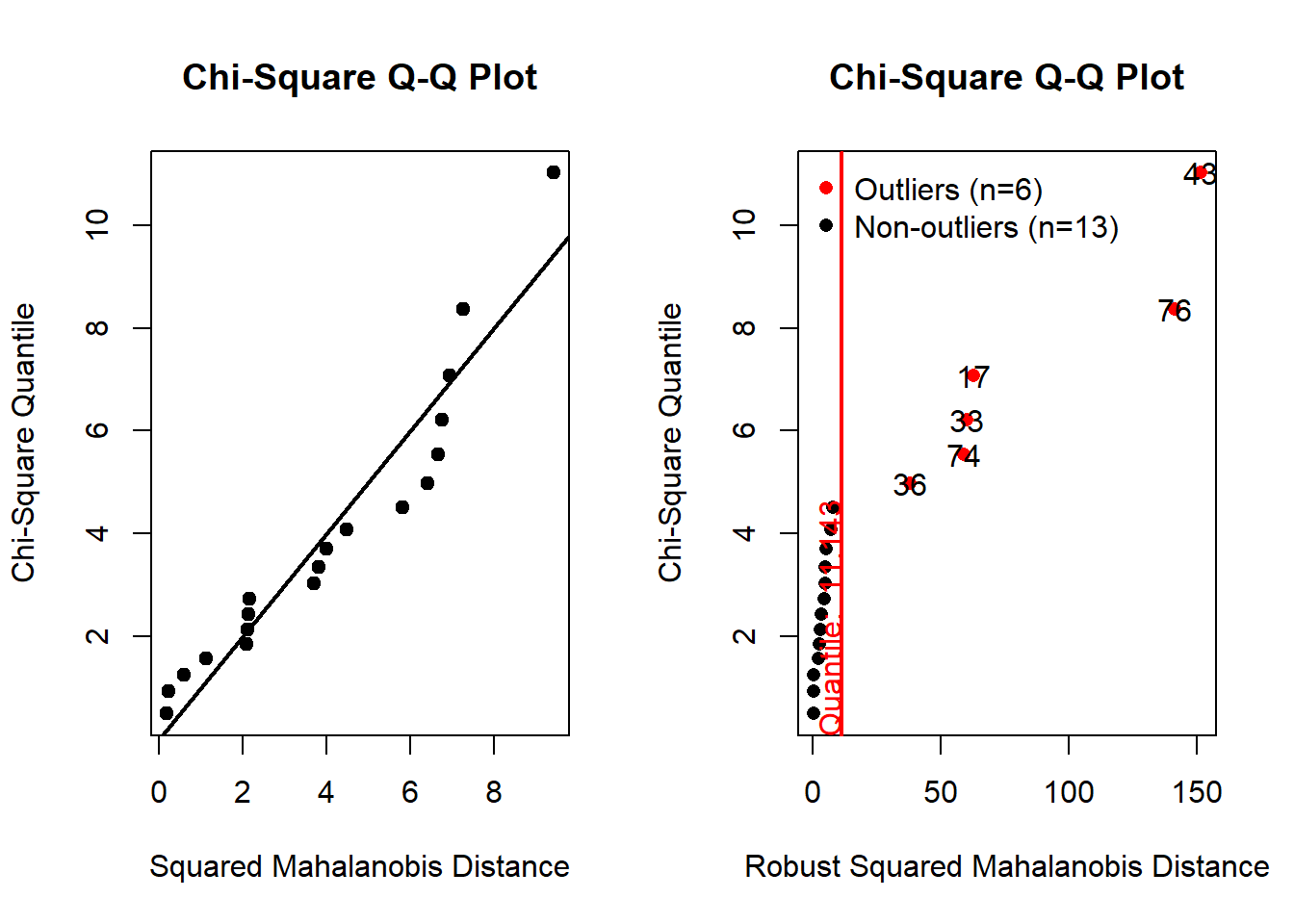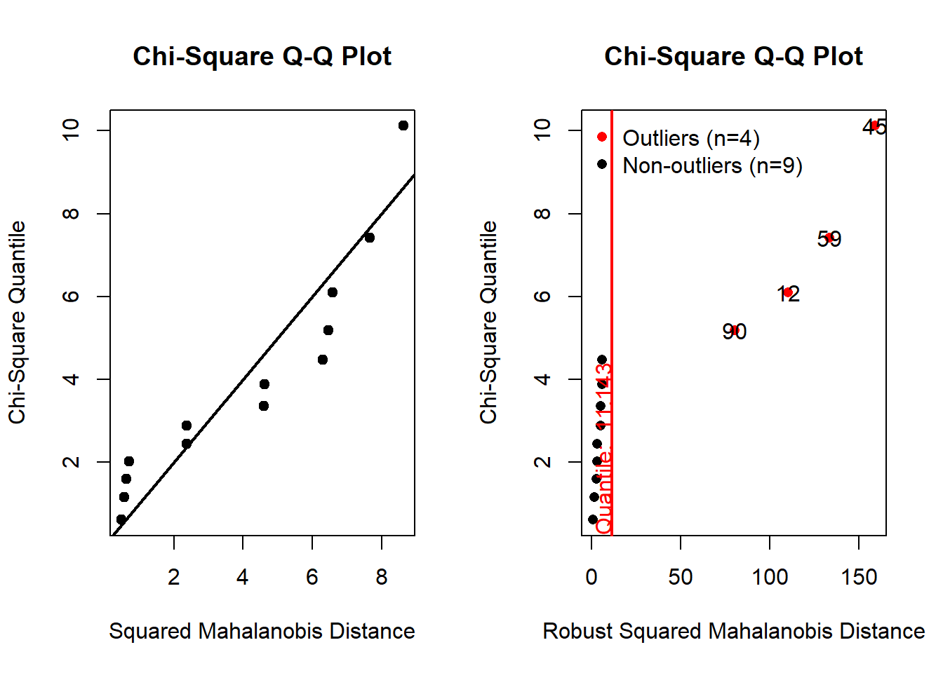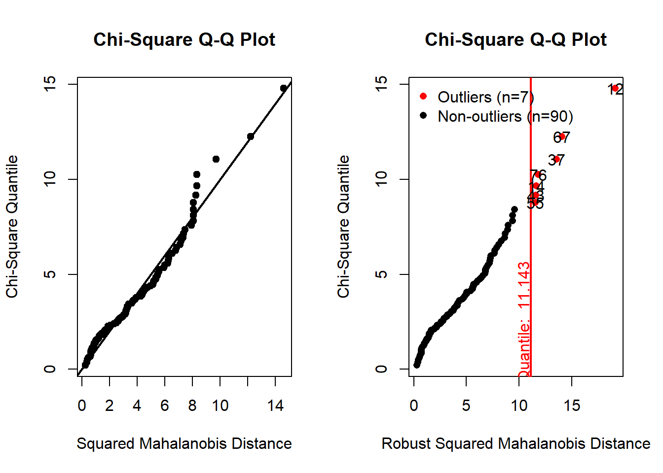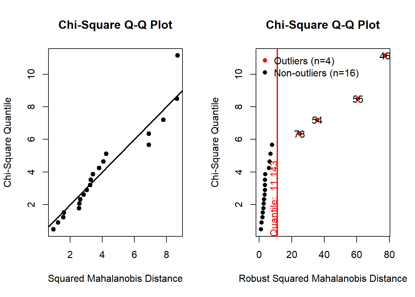 Therefore, now we have multivariate vectors \(X=(Y_{1},Y_{2},Y_{3},Y_{4})\). Now we are interested in testing the multivariate normality of X. There are several ways ( both graphical and theoretical ) to check for multivariate normality. We apply the following :