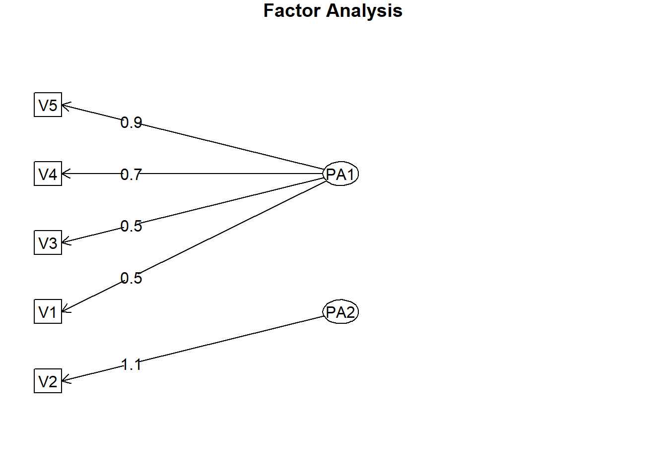 Call: fa(r = D[, -6], nfactors = 2, rotate = "varimax", scores = "regression",